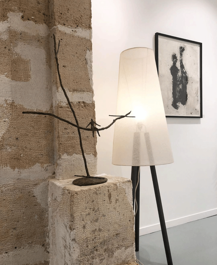 Trois pieds solidement ancrés, partiellement recouverts par une robe qui rappelle le chapeau d’une fée médiévale ou les robes « haricot » de Twiggy, force et féminité , réalit et abstraction, stabilité et élévation Une transparence qui révèle la structure, et diffuse un éclairage d’ambiance. choisir parmi une gamme étendue de couleurs dans les tons chauds et froids.