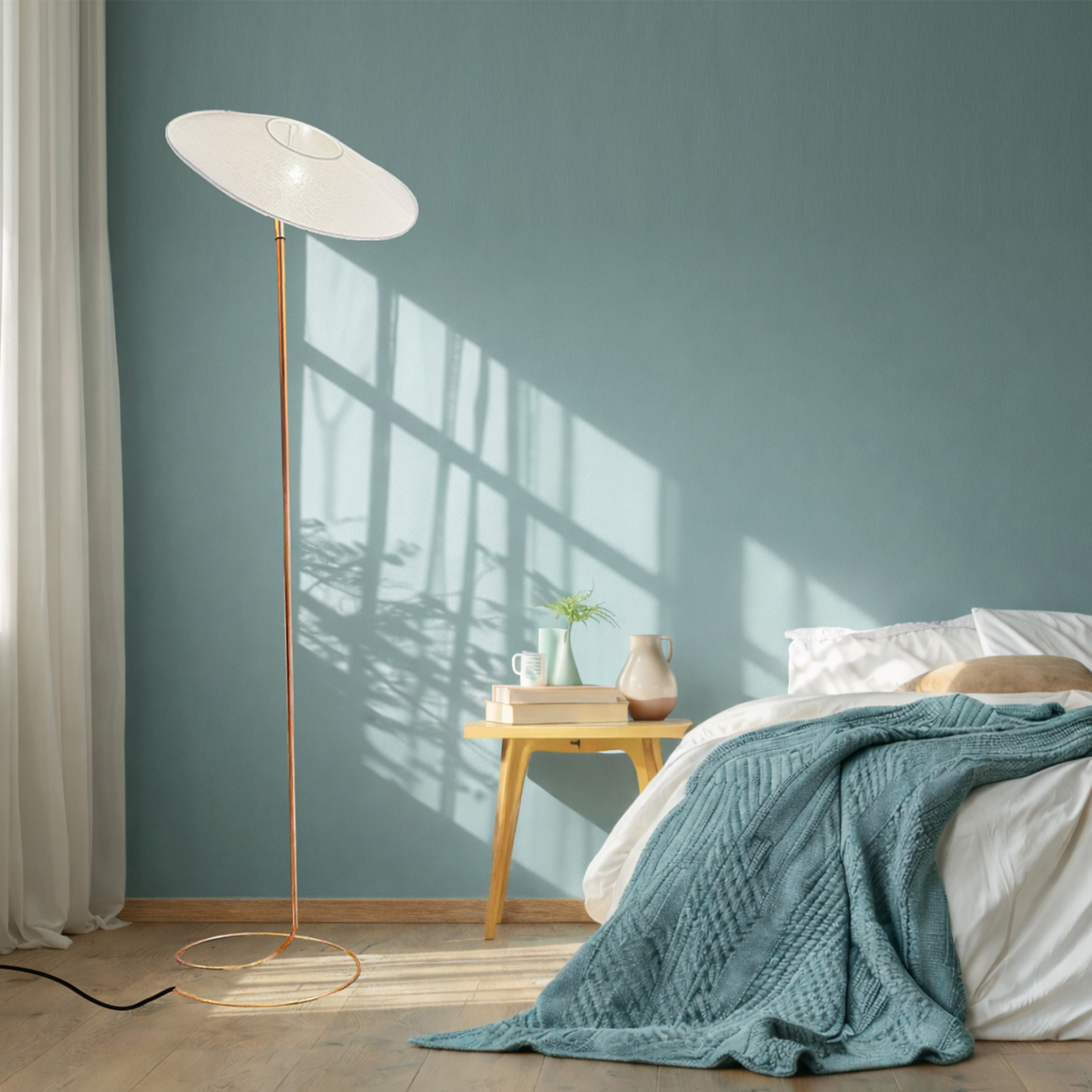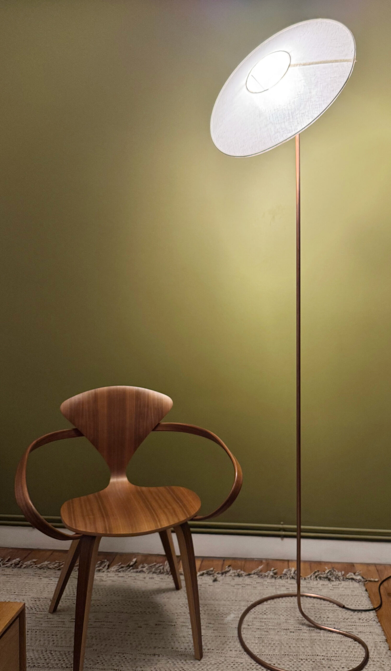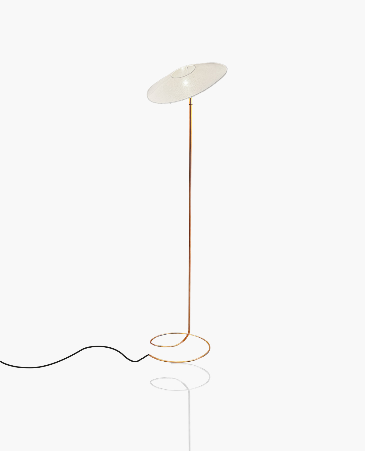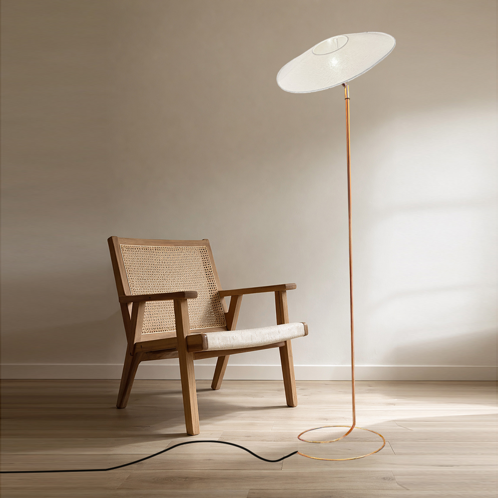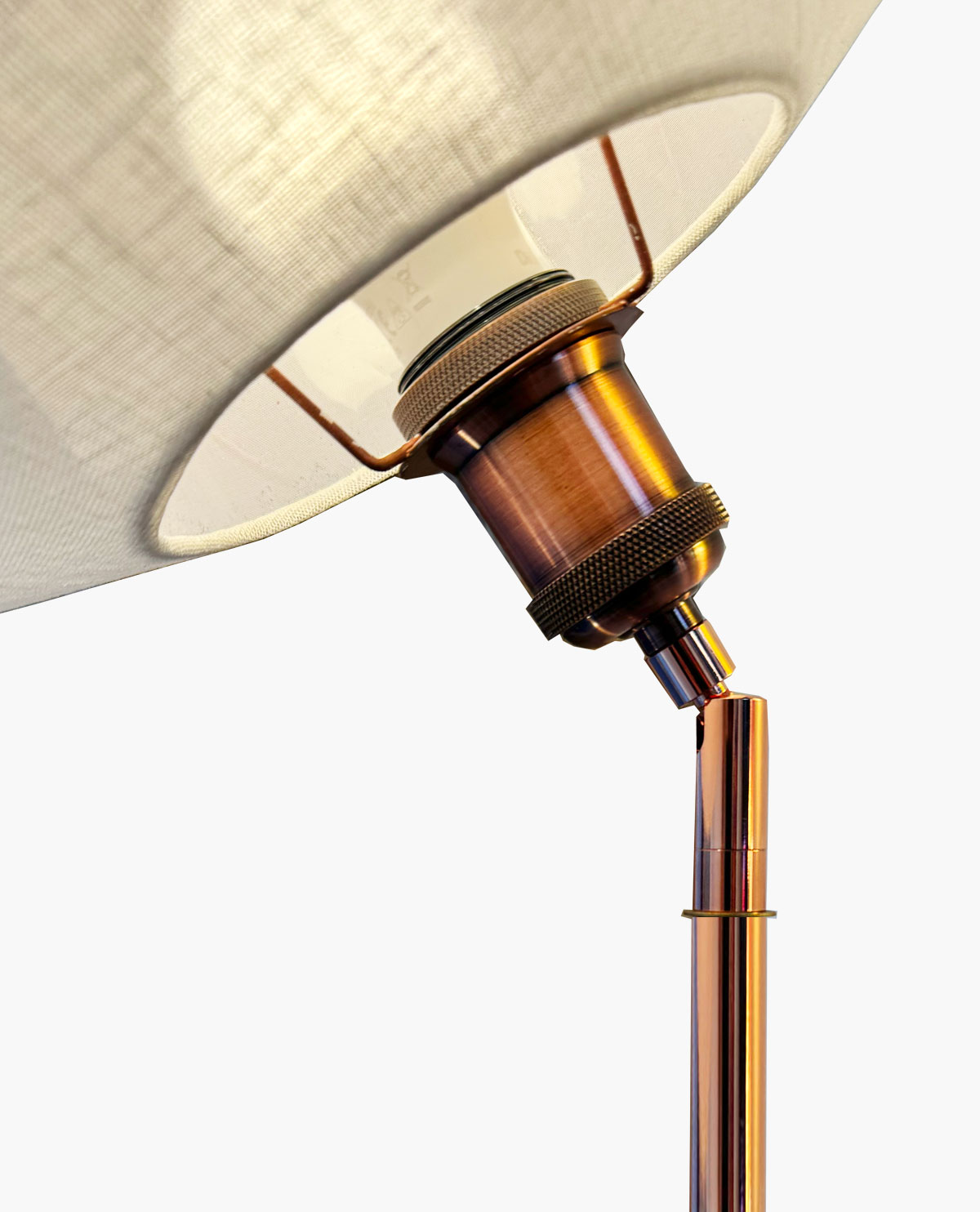Il est réalisé en lin (abat-jour textile) et repose sur un pied en cuivre façonné à la main.